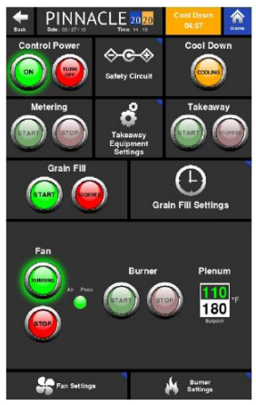 Cool Down mode can be forced by simply pressing the Cool Down button on the Controls page. Doing so will shut down the burner(s), fill cycle and metering. Equipment associated with Takeaway 1 and 2 will begin their shutdown sequence after the takeaway timer, on the fan settings page, expires. The fan(s) will shut down as soon as the Cool down timer, also on the fan settings page, expires.
