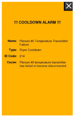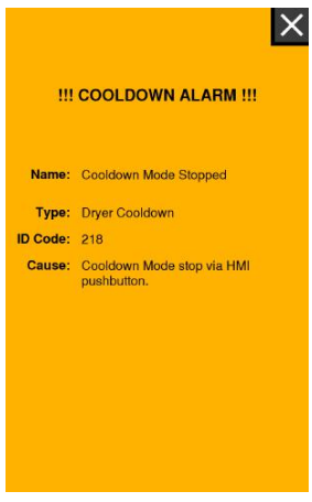 One of the types of alarms that can occur are Cool Down alarms. When a Cool Down alarm occurs the dryer will enter Cool Down mode and the alarm popup will be orange as shown below: