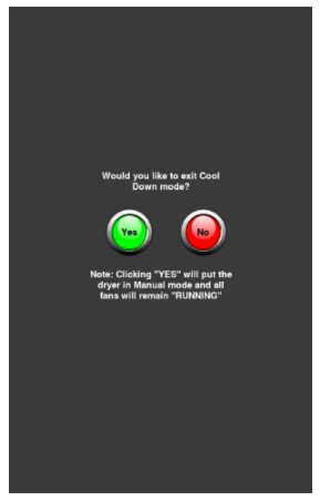 Pressing the Cool Down timer button while the dryer is in Cool Down mode will cause the pop up below to appear, allowing the user the ability to cancel Cool Down mode or continue with it.