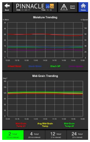 For convenience, the Mid-Grain Trending graph is directly below the Moisture Trending graph. These two graphs are in-line with each other, allowing the x-axis of both trends to be in sync. This makes it easy to read both the moistures and Mid-Grain temperatures at a given time since the time is plotted on the x-axis.
