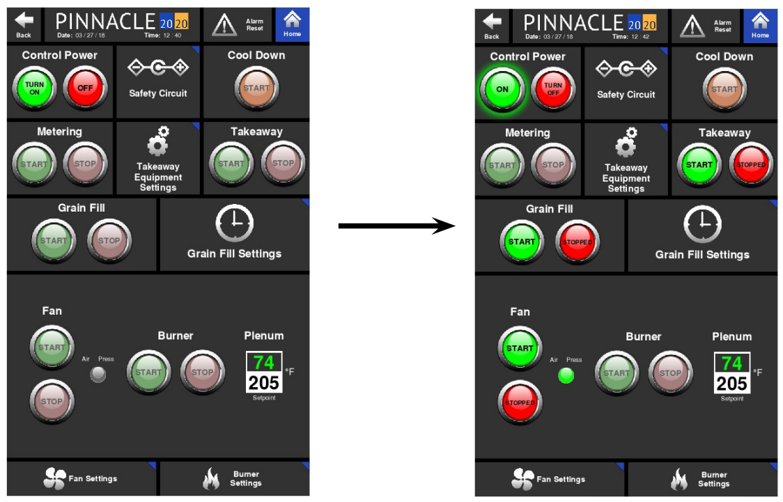 When first starting the dryer, the Control page will need to be accessed. The Control page layout differs slightly from dryer model to dryer model. It is here where the Control Power, Grain Fill, Discharge, Fan, Blowers, and Burners can all be started from the same page. Each function such as Grain Fill, Discharge, Fans & Burners are grouped in boxes or tiles. It is within these tiles where the associated command buttons are located. The green buttons are "START" or "ON" buttons while the red buttons are "STOP" or "OFF" buttons. These command buttons are designed to communicate to the operator the feature's status and available function by way of color and text within the button. For a pair of buttons, one will have text within it that reads the status (ON, OFF, or RUNNING) while the other button will have text that reads the available command (TURN OFF, TURN ON, or STOP). The text and color within and around the buttons change as the status and available function changes.