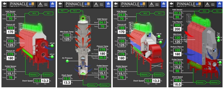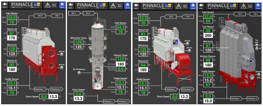 The Overview page is the second page of the three Operation pages. The Overview page provides the operator with a full rendering of the dryer that, with the use of different graphics, illustrates what components of the dryer are operating. The Overview page is unique to match the particular dryer that is loaded on the Pinnacle 20|20. The images below show the different Overview pages for a Legacy, Tower, ECO, and Delta dryer. In the Overview pages, shown below, none of the dryer components (motors, burners, etc.) are running.