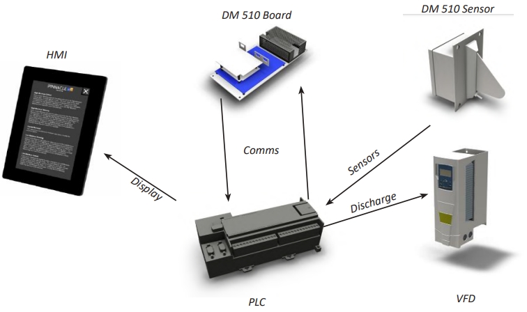 AccuDry technology utilizes the Dryer Moisture Systems Dryer Master DM510 system. The DM510 system uses specially designed in-line moisture and temperature sensors located at both the infeed and discharge of the dryer. These sensors provide continuous moisture and temperature readings to the PLC, which is shared with the DM510 logic board.