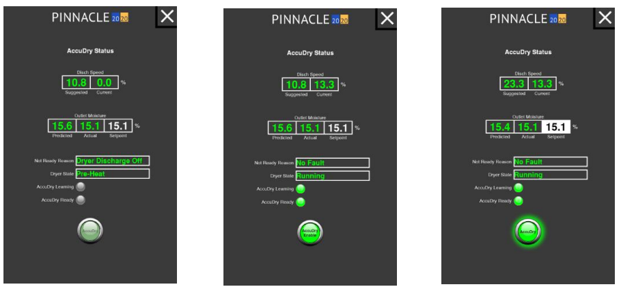 While running in manual when the AccuDry button text will change from gray to white, AccuDry reaches the "Ready" state. Pressing the AccuDry button will again cause the AccuDry status screen to appear. When AccuDry is selected from this screen, the button will flash "Enabling..." for a few seconds and will illuminate the AccuDry text in green lettering; the dryer is now in AccuDry mode.