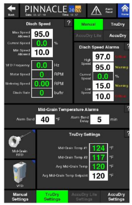 The TruDry Settings page is very similar to the Manual Settings page. The only difference, other than the component quick launches, is the "Set Discharge Speed" box displayed on the Manual Settings page has been replaced by mid-grain temperature boxes.