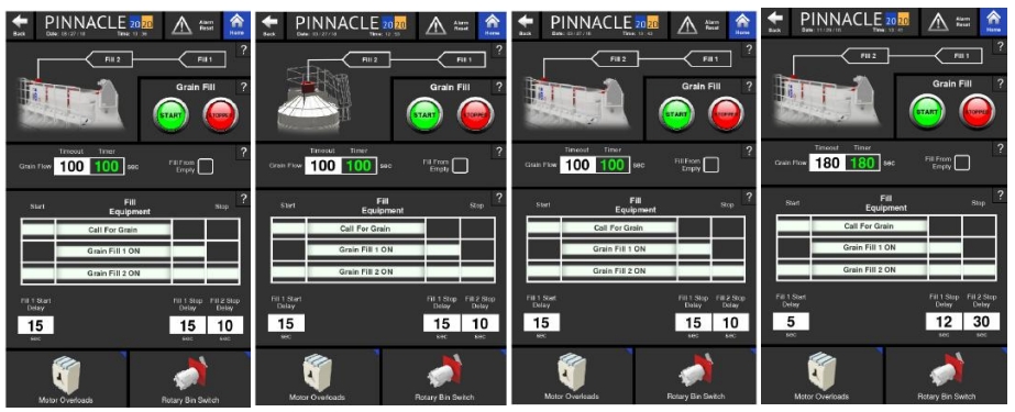 Following the logic of the chart, the grain fill sequence starts with a call for grain. The call for grain comes when the rotary bin switch in the hopper starts rotating, due to the lack of grain. This call for grain starts all equipment associated with Fill 2 after the Fill 2 Start Delay has elapsed. After the Fill 2 Delay Timer finishes, the Fill 1 Start Delay timer will begin to countdown. Once the Fill 1 Start Delay timer expires, all equipment associated with Fill 1 will start.