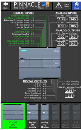 The fourth of the five options under Troubleshooting is PLC I/O Modules. The PLC and I/O modules are located in the Low Voltage Cabinet. The number of I/O modules depends on the model dryer. On the bottom of the page, only the I/O modules equipped on the dryer will be lit up, and therefore able to be accessed. The grayed out options cannot be accessed as those modules are not equipped on the dryer. Also, the order in which the PLC and I/O modules appear, should match the actual arrangement in which they are physically installed in the Low Voltage Cabinet.