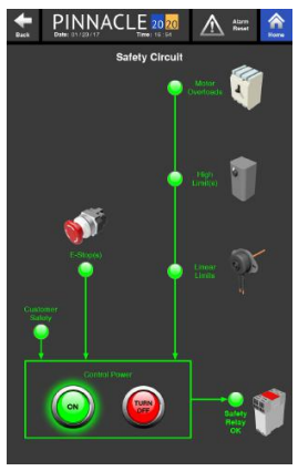 Components with green globes next to them indicate components that are good and satisfying that part of the safety circuit. However, if a globe next to the component appears grayed out as opposed to green, that indicates that there is a break in the safety circuit at that particular component. Furthermore, if there is an issue with a component, all components downstream will appear grayed out as well. It is best to check the component that is first in line where the globe is gray. For instance, if the motor overloads are grayed out, the high limits and linear limits (if equipped) will appear grayed out as well. First start troubleshooting the motor overloads, which are upstream from the High Limits and Linear Limits. It is very likely once the issue with the motor overloads are solved, the all other components downstream will glow green as well, satisfying the safety circuit. If not, move on to the next grayed out component downstream and troubleshoot.