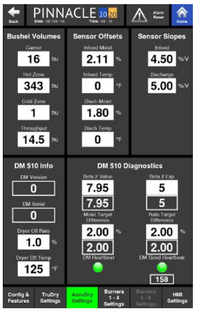 These tiles are where trained service technicians can manually adjust the DM sensor values. The two values that calculate the moistures are the slope and offset values. The voltage measured by the sensor is mutiplied by the slope and then added to the the offest value of the sensor, resulting in a % moisture value. Here, the technician can save time by manually adjusting the slope (not recommended) and/or offset value (preferred) in order to alleviate the need to calibrate multiple times upon initial setup, due to the 0.5% restriction placed on normal calibration routines. The technician may simply enter the desired offset with a single touch of the button, eliminating the need to calibrate several times.