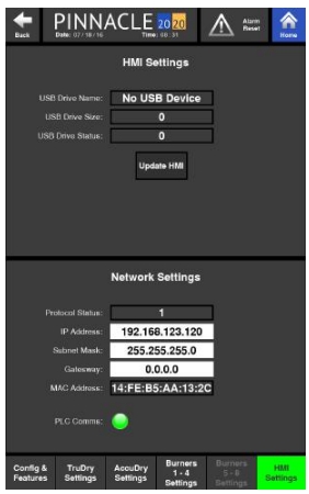 The bottom half of the page displays the Network Settings along with a PLC comms button that illuminates green when the PLC is communicating properly.