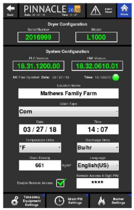 A check box is provided to allow the dryer to be operated remotely by way of M-C Trax. When operating from a remote location, this box must be checked. When a change is made remotely, a pin will be required to be entered. This pin must match the Remote Access 4-Digit pin shown on this page of the HMI.